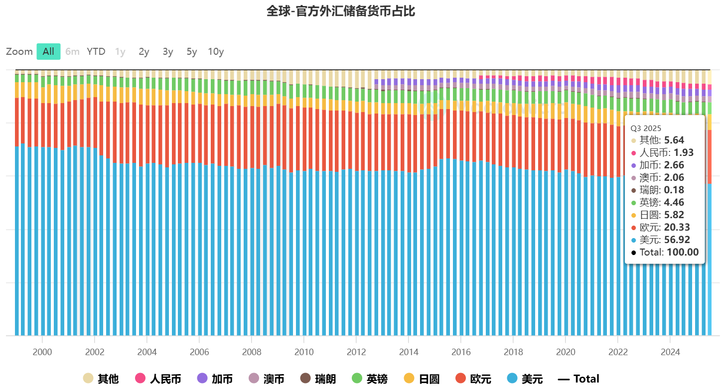 回望2025年,金融市场中最亮眼的无疑是贵金属。据市场数据,黄金涨幅超过70%,白银涨幅更达190%。理论上,黄金、白银与美元呈负相关,二者的涨跌幅应是相似的,但2025年美元跌幅约8%,这说明美元对贵金属的控制力在下降。全球掀起 “抛美元、购黄金”浪潮,主因在于美元信用风险攀升。为对冲该风险,各国政府和主要央行近年来积极推动储备多元化,大幅增持黄金。随着美国军事霸权的衰落,各国去美元化进程或将进一步提速。