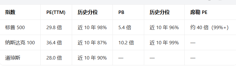 标普500的PE较1871年以来均值(16.2)高84%,较中位数(15.1)高98%;纳斯达克100的PB接近历史极值,科技龙头估值溢价明显;席勒PE显示标普500约40倍,仅低于2000年互联网泡沫峰值,长期回报空间被大幅压缩。