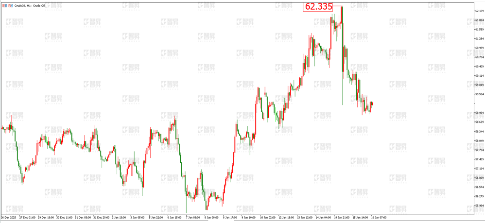 技术面:原油上周自56美元一线大幅上涨,一度上破62美元,昨日(1月15日)短线出现大幅回落,上涨势头有所放缓,下方重点关注55美元的支撑。日内关注58.40美元的多空分界。